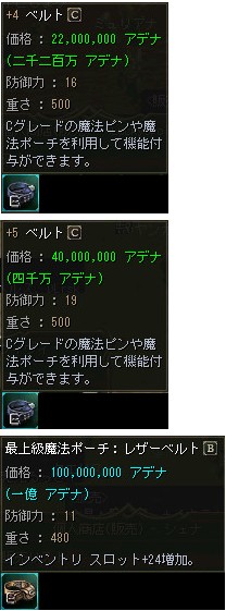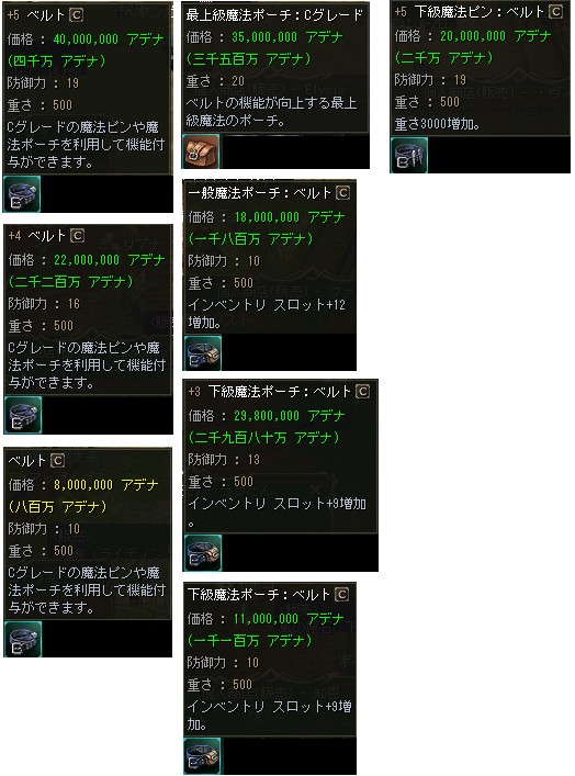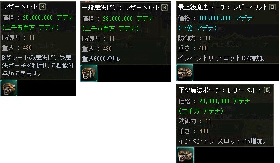 補給品の箱から手に入るベルトですが、ベルト単体では防御力を向上させるだけの装備アイテムに過ぎません。ベルトの真価を発揮するには「魔法ポーチ」または「魔法ピン」というアイテムが必要となります。所持しているベルトと、同じグレードの魔法ポーチ、または魔法ピンを用意し、ルウン城の村にいる「機織職人 ウルフ アダムス」、またはアデン城の村にいる「機織職人 ウルフ カノーレ」に話しかけ封印を解除した後、付加価値のついたベルトに加工していただくことでもっと便利なアイテムに変化いたします。ベルトを加工する際には「ベルトを買う」という選択肢を選び、自分の所持しているアイテムに沿ったベルトを選択する必要があります。尚、魔法ポーチ、魔法ピンを封印解除する際に一定確率で失敗する可能性があります。その場合は封印解除にかかったアデナ、アイテムが消滅してしまいますので、予めご注意下さい。