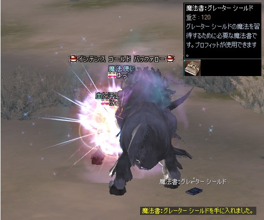 夕飯を食べた後、狩場に戻って来ると、グレーター・シールドの魔法書狙いで牛狩りばかりをしているプロフさんがいました。