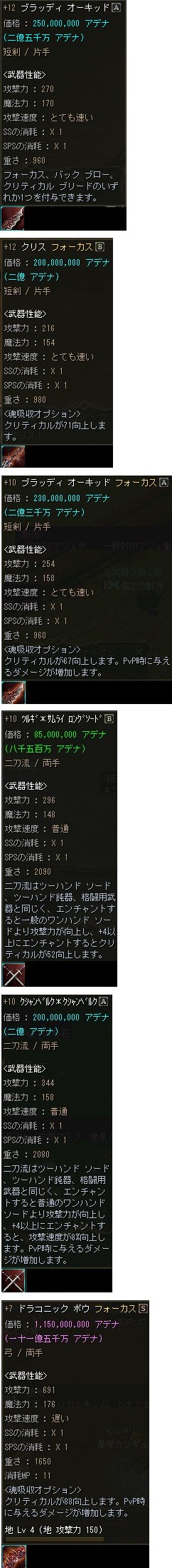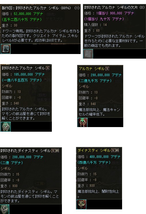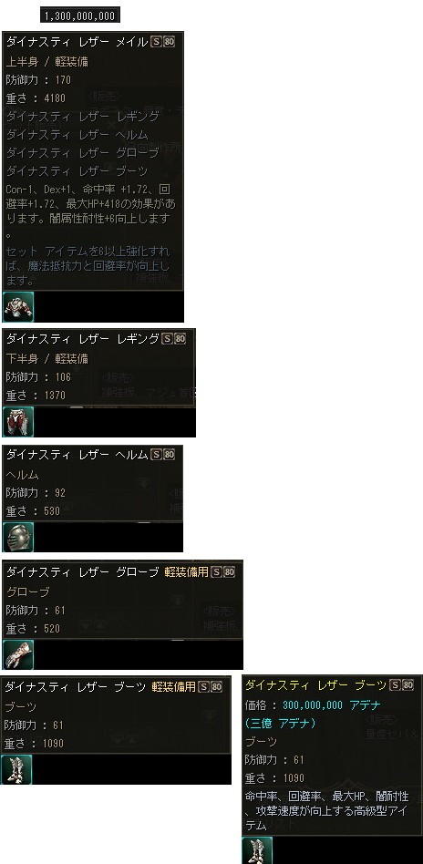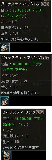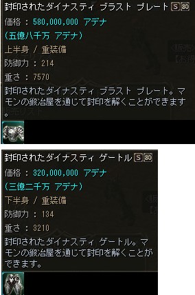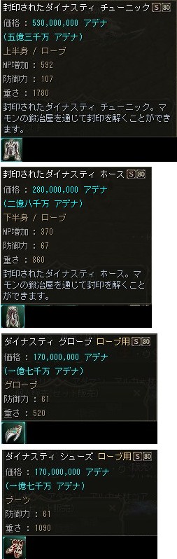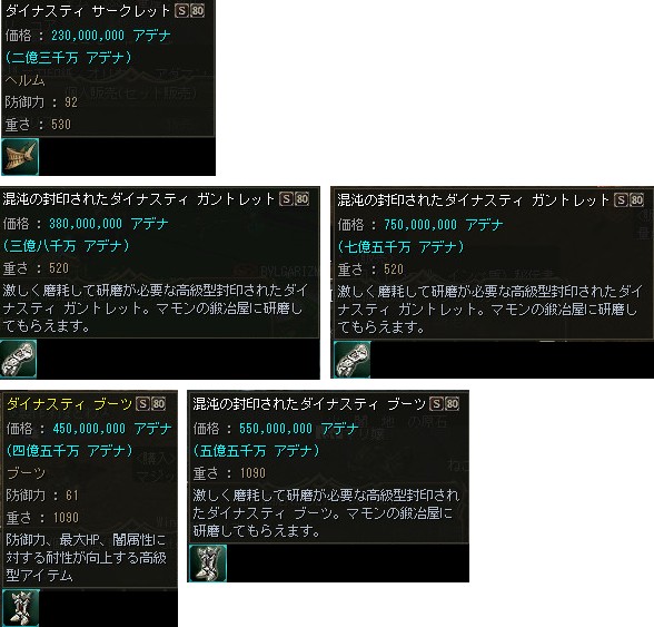 2009/04/07/Tue「2Tu」へのアップデートが実施されましたが、Sグレ中級装備となったダイナスティ・シリーズの製作に必要なコアの個数が減少した事もあり、メンテ明けから武器・防具共にS80装備が一気に露店で販売され始めました。 |