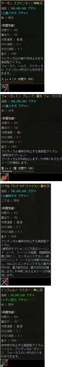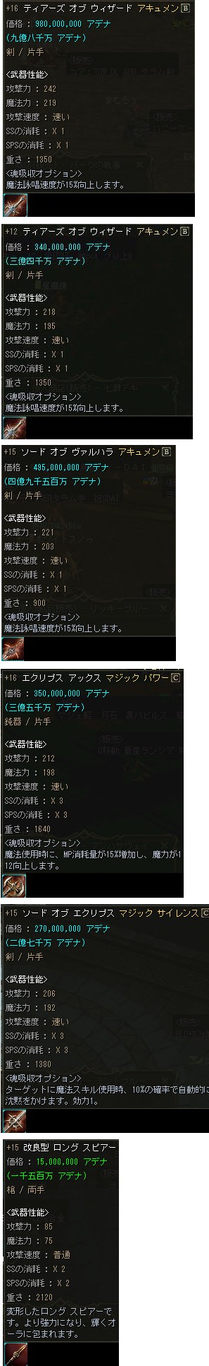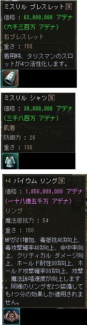 5月からは領地戦が始まるので、CP増加の為にアペラを買い込む人も居るのかも知れませんが、全体的に装備効果が同グレの防具に比べると貧弱な為、手を出す気にはなれませんね。
