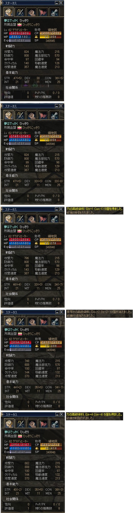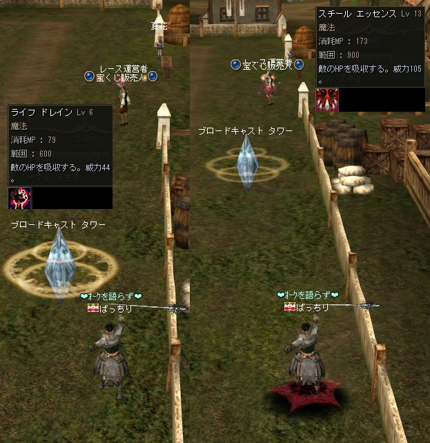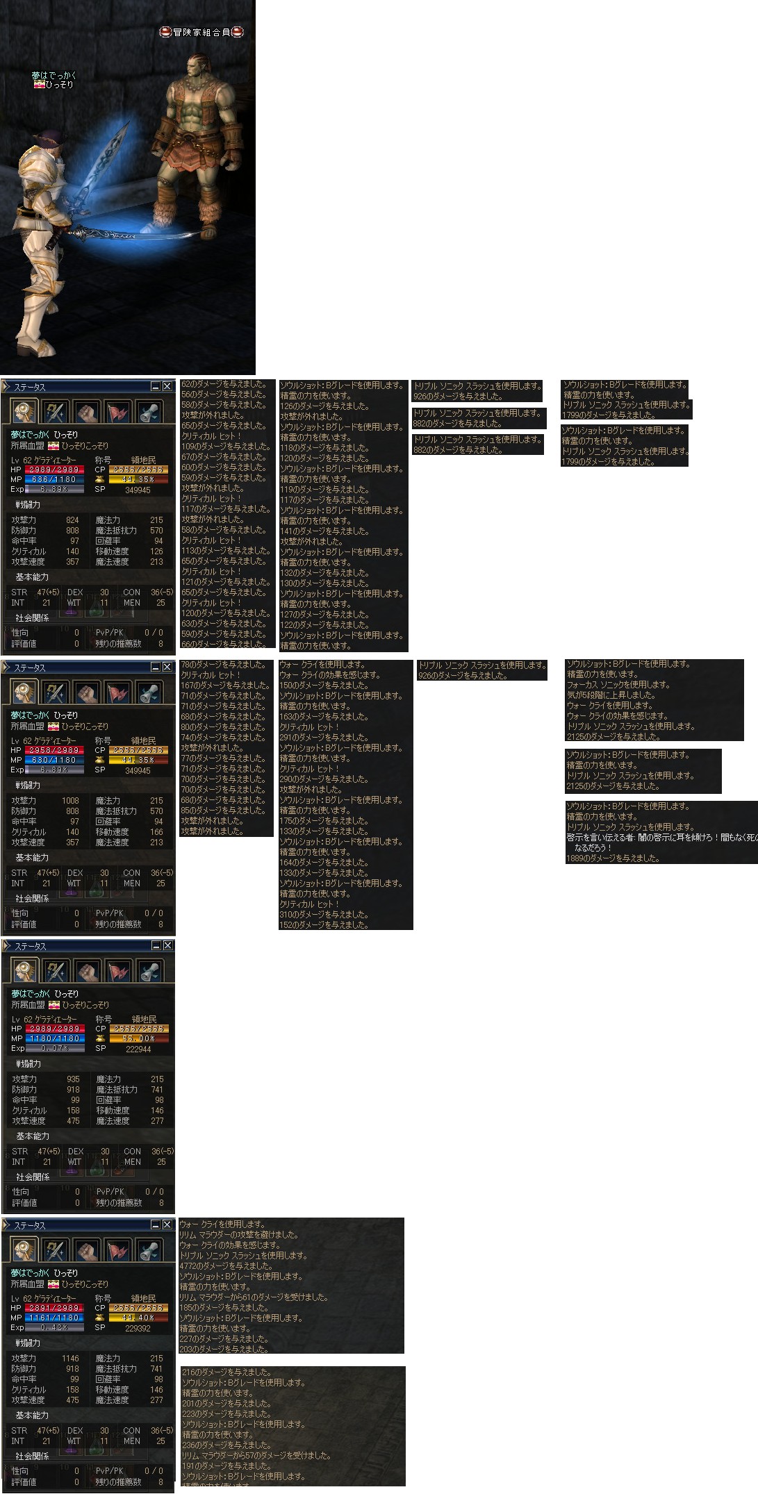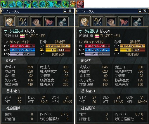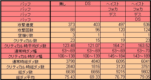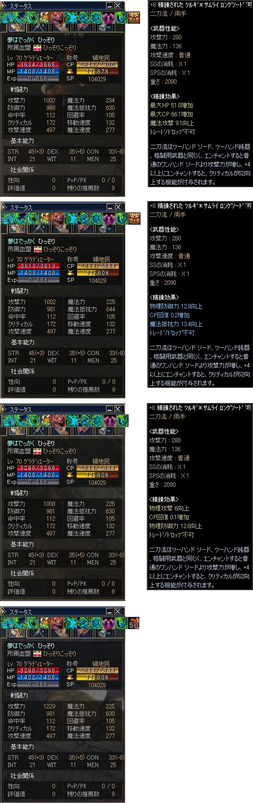 以下の数値は、レベル36のウォーリアー、ひっそりさんが各武器を装備した際の数値で、左からレボ剣、アトゥバメイス+1、バスタードソード*エルブンソードの順となっていますニョ。